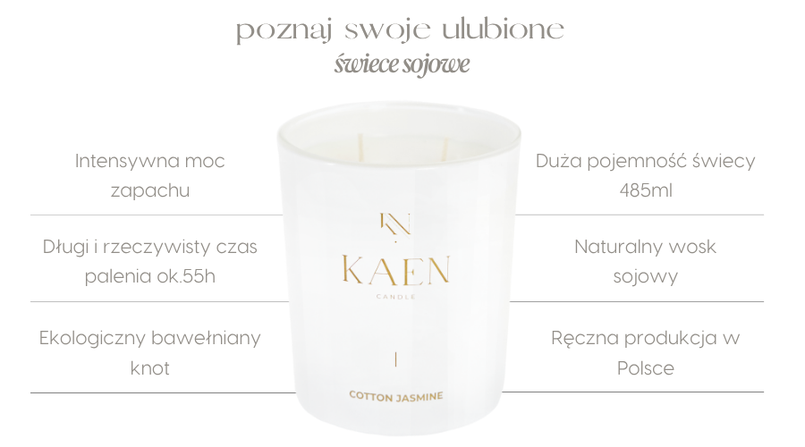 Świeca sojowa ręcznie wytwarzana w Polsce ze 100% naturalnego wosku sojowego tworzy atmosferę, w której łatwiej się oddycha i czujesz się jak podczas pierwszego snu w świeżo wypranej i wywietrzonej na świeżym powietrzu pościeli.